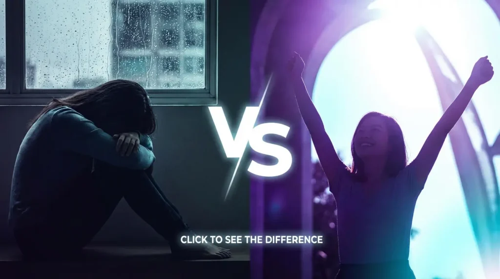 Pro Tip: Use opposite emotions on each side (happy/sad, clean/messy, rich/poor). Maintain 50/50 split visually. Use contrasting color backgrounds—one warm, one cool. Add “VS” or question text in the middle.